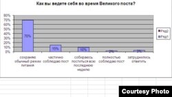 - Цифры в высшей степени показательны. Сохраняют обычный режим питания примерно 70%, и примерно такое же количество людей у нас заявляют, что они православные. При этом полностью соблюдают пост 2%, и это примерно столько людей, сколько регулярно посещают церковь и участвуют в таинствах церковных. Эта цифра как раз и показывает отличия между количеством людей, которые заявляют себя православными, но по существу - люди либо не воцерковленные, либо вообще не интересующиеся христианством, а заявляющие о своем православии формально, по факту крещения либо, как отмечают часто социологи, заменяя религиозную идентичность национальной, социальной, гражданской, культурной (то есть считают, что они русские или граждане России, или просто крещеные).