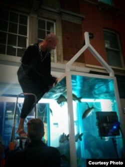 Олег Кулик: Не только символ Христа, сколько другая среда. Я хотел погрузиться в другую среду, отличную от той среды, в которой обычно существуешь. Воздух не очень доступен, хотя я люблю перформансы, я прыгал с крыши, а вода – это другое пространство. Замысел был такой, я же все-таки художник: Лондон, циничный город, живут бизнес-люди, и в аквариуме сидит человек в позе лотоса и читает Библию. Такая идея совершенства. Общается с Богом, общается с природой, он в ином пространстве измерения – вот это была картинка.