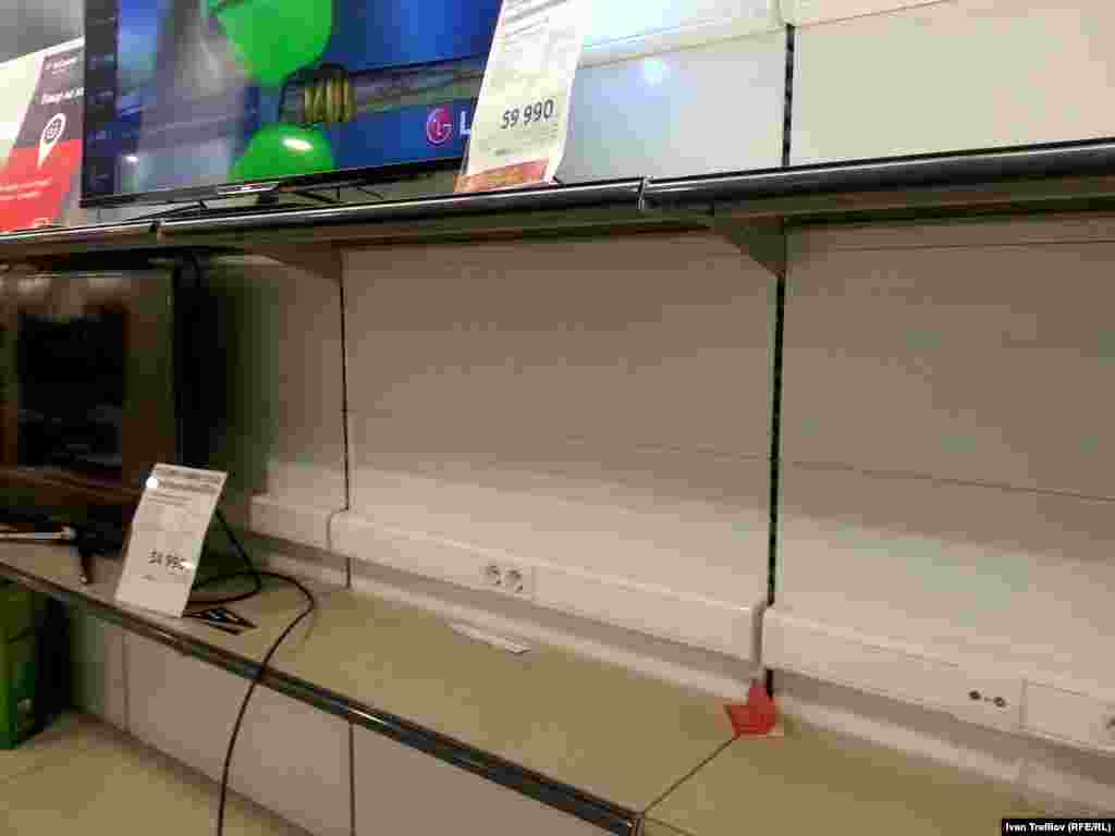 В России наблюдается ажиотажный спрос на отдельные виды товаров, в первую очередь, на бытовую технику и электронику. Отчасти такие рекордные продажи связаны с наступающим праздником, но основная причина – в желании людей вложить свои обесценивающиеся рубли перед неминуемым повышением цен. В результате этой массовой скупки товаров в некоторых магазинах Москвы, например, уже заметно их полное или частичное отсутствие. Фотографии сделаны смартфоном