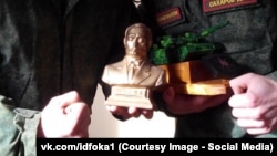 В той же публикации есть еще одна фотография – на ней солдаты стоят с призами в руках, "деревянным танчиком" (как он назван в комментарии автора публикации) и бюстом российского президента.