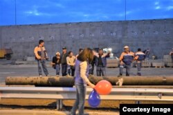 Из автомагнитол надрывается Григорий Лепс, "счастливый как никто", – под него, размахивая флагами, танцуют учителя и воспитатели. Кто-то открыл шампанское, другие ищут удачные ракурсы для снимков на фоне "стройки века".
