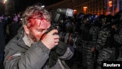 Фотограф агентства "Рейтер" Глеб Гаранич, получивший ранение во время столкновений на Майдане, фотографирует бойцов спецподразделений.