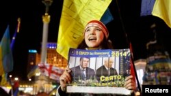 Девушка на площади Независимости в Киеве держит плакат, на котором президент Украины Виктор Янукович и премьер-министр Николай Азаров изображены за решеткой. 4 декабря 2013 года.