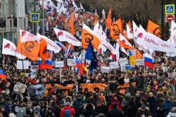 А вот такие кричалки на марше памяти Бориса Немцова в Москве – про планы властей внести изменения в Конституцию страны здесь не забывают: "Путина отставка – лучшая поправка!"