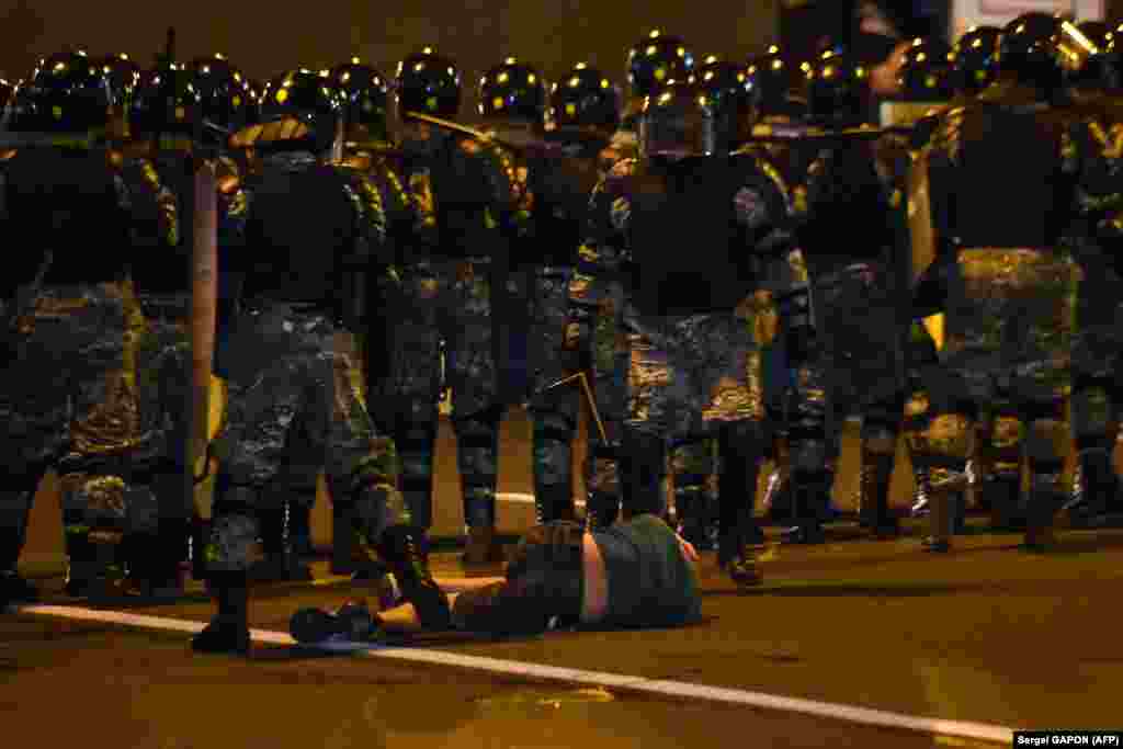 Minsk, Belarus - A law enforcement officer kneels next to a man laying on the ground during clashes with opposition supporters after polls closed at the presidential electio