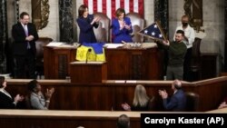 В заключение выступления президент Украины передал спикеру Палаты представителей Нэнси Пелоси украинский флаг с автографами украинских солдат, находящихся на передовой линии обороны в Бахмуте.