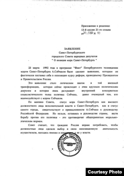 30 марта 1992 г. 13 сессия Петросовета приняла решение "О целесообразности освобождения от должности мэра Санкт-Петербурга А.А.Собчака и обращении к Президенту РФ и в Конституционный суд РСФСР". Одновременно сессия приняла заявление "О позиции мэра Санкт-Петербурга", которое я привожу полностью.