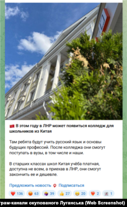 Сообщение об открытии китайского колледжа на 300 учеников начало появляться в российских СМИ, после чего его распространяли местные телеграм-каналы. Риторика такова: "Иностранцы будут изучать русский язык и основы будущих профессий, а затем смогут поступить в российские вузы". Китайцы вроде бы даже уже ищут соответствующее помещение и регистрируют юридическое лицо в Луганской области. Правда, по какому законодательству они это делают, непонятно.