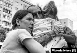 Из окна автобуса они видят радостную толпу встречающих: это все те, для кого война стала ощутимой на личном, частном уровне отдельной семьи – их родные мужчины ушли защищать Украину и пропали без вести или оказались в российском плену. Одни разворачивают огромные, чуть не в человеческий рост баннеры с именами и фотографиями сыновей, братьев, мужей, друзей, другие держат самодельные плакаты, а кто-то и просто тетрадные листы с фамилиями. Многие знакомы: принимают участие в постоянных акциях поддержки военнопленных - так они поддерживают и друг друга.