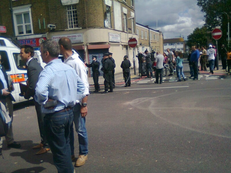 На следующий день главная улица Тоттенхэма была по-прежнему перекрыта, на границе оцепления посередине дороги осталась машина, в которой лишь с трудом можно было опознать полицейскую, настолько она обгорела. Собравшаяся вокруг толпа обсуждала происшедшее.